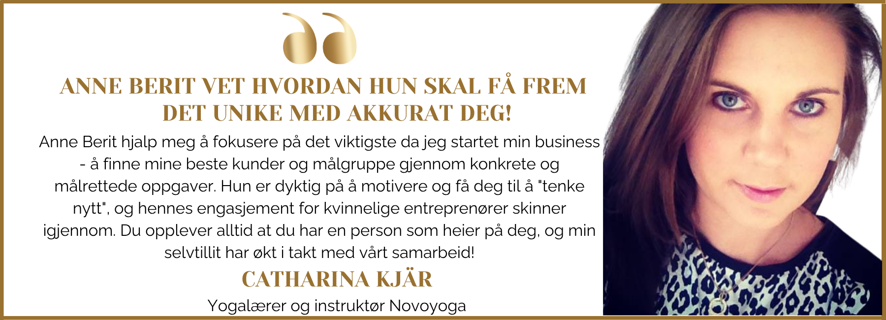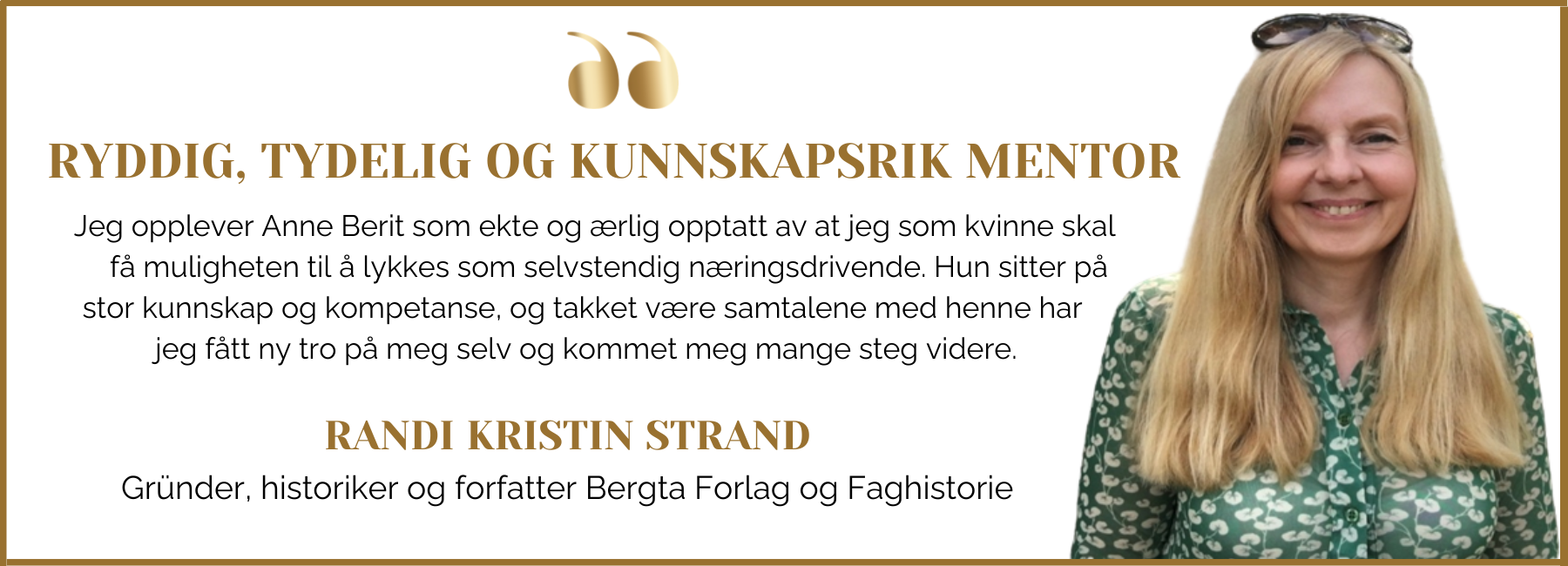 Mitt navn er Anne Berit. Jeg har over 40 års erfaring som selvstendig næringsdrivende, og jeg brenner for å hjelpe dyktige kvinner å oppdage sin unike suksessnøkkel — og bygge sin karriere og business på den de faktisk er.
